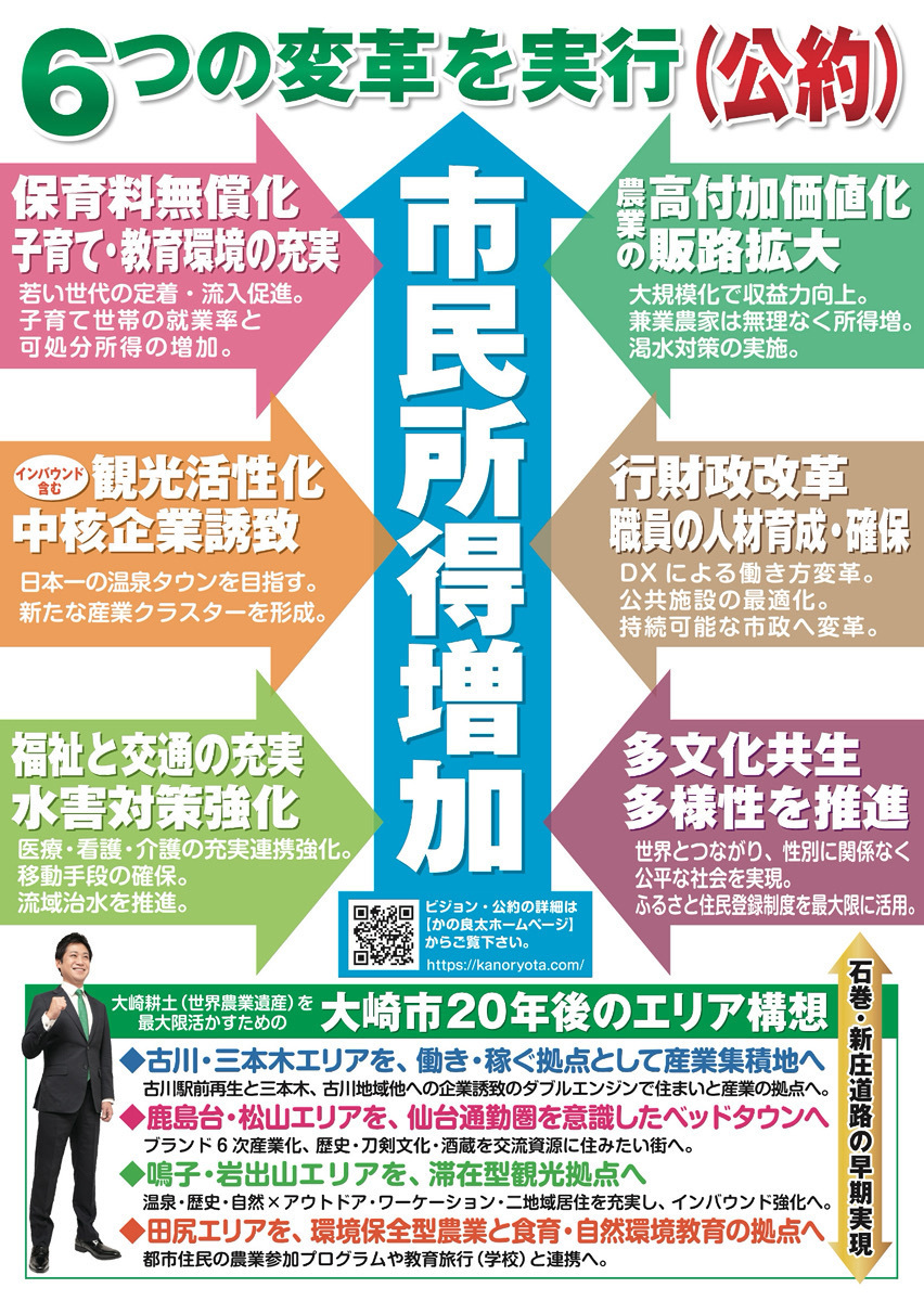 など、20年後の大崎を見据えた6つの変革(公約)を掲げ、オール大崎で次世代の地方都市を創ります 。